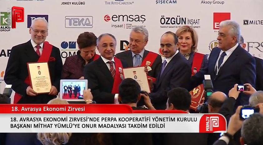 18. Avrasya Ekonomi Zirvesi’nde on yılını idrak eden üye olarak Perpa Kooperatifi Yönetim Kurulu Başkanı Mithat Yümlü’ye onur madalyası takdim edildi.