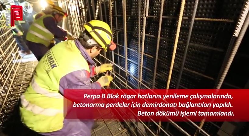 Perpa B Blok rögar hatlarını yenileme çalışmalarında, betonarma perdeler için demir donatı bağlantıları yapıldı. Beton dökümü işlemi tamamlandı.