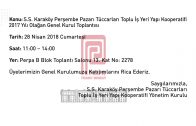 S.S. Karaköy Perşembe Pazarı Tüccarları Toplu İş Yeri Yapı Kooperatifi 2017 Yılı Olağan Genel Kurul Toplantısı 28 Nisan 2018 Cumartesi saat 11:00’de Perpa B Blok Toplantı Salonu’nda (13. Kat No: 2278) yapılacaktır. Üyelerimizin genel kurulumuza katılımlarını rica ederiz. Perpa Kooperatifi Yönetim Kurulu