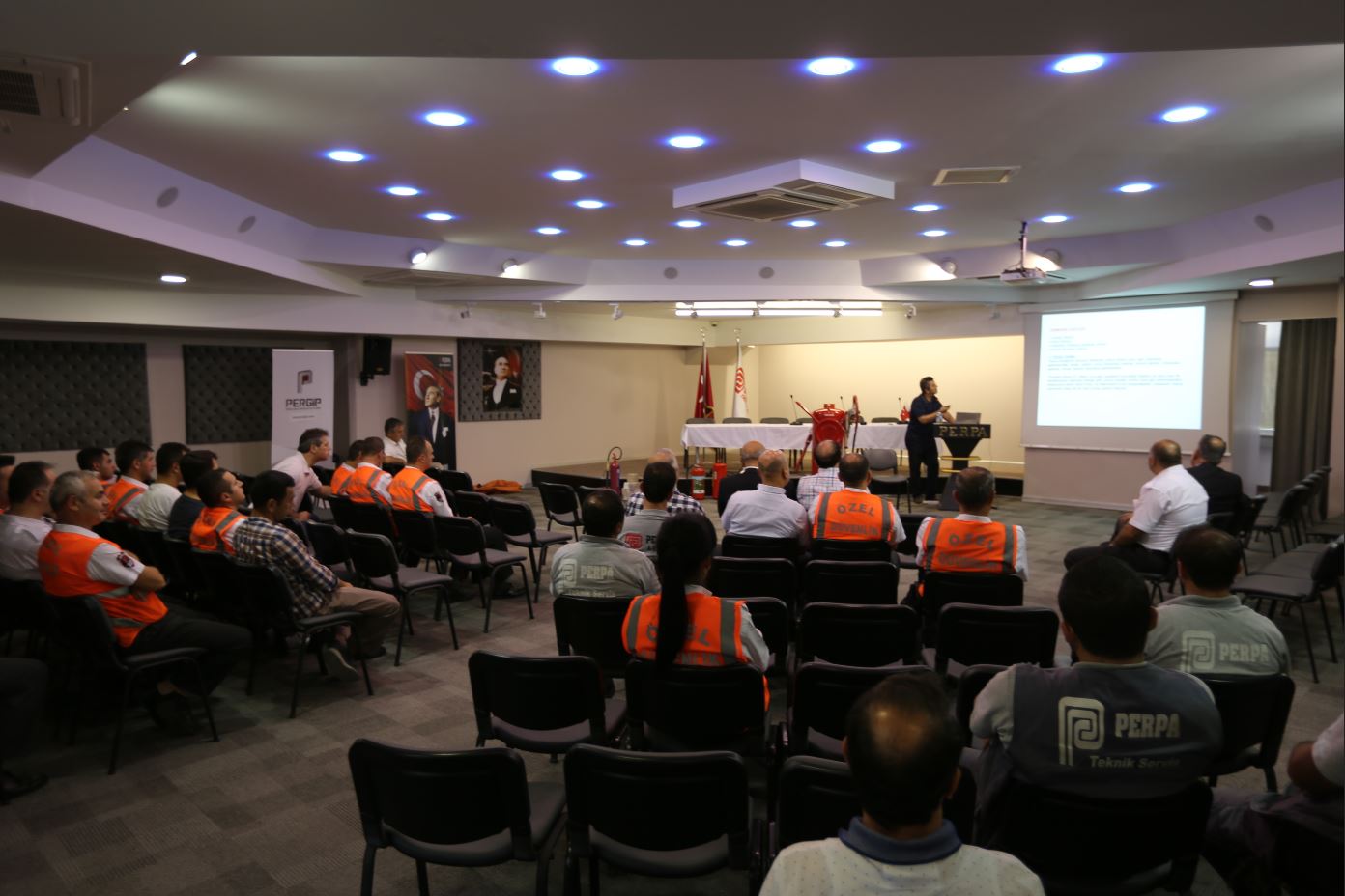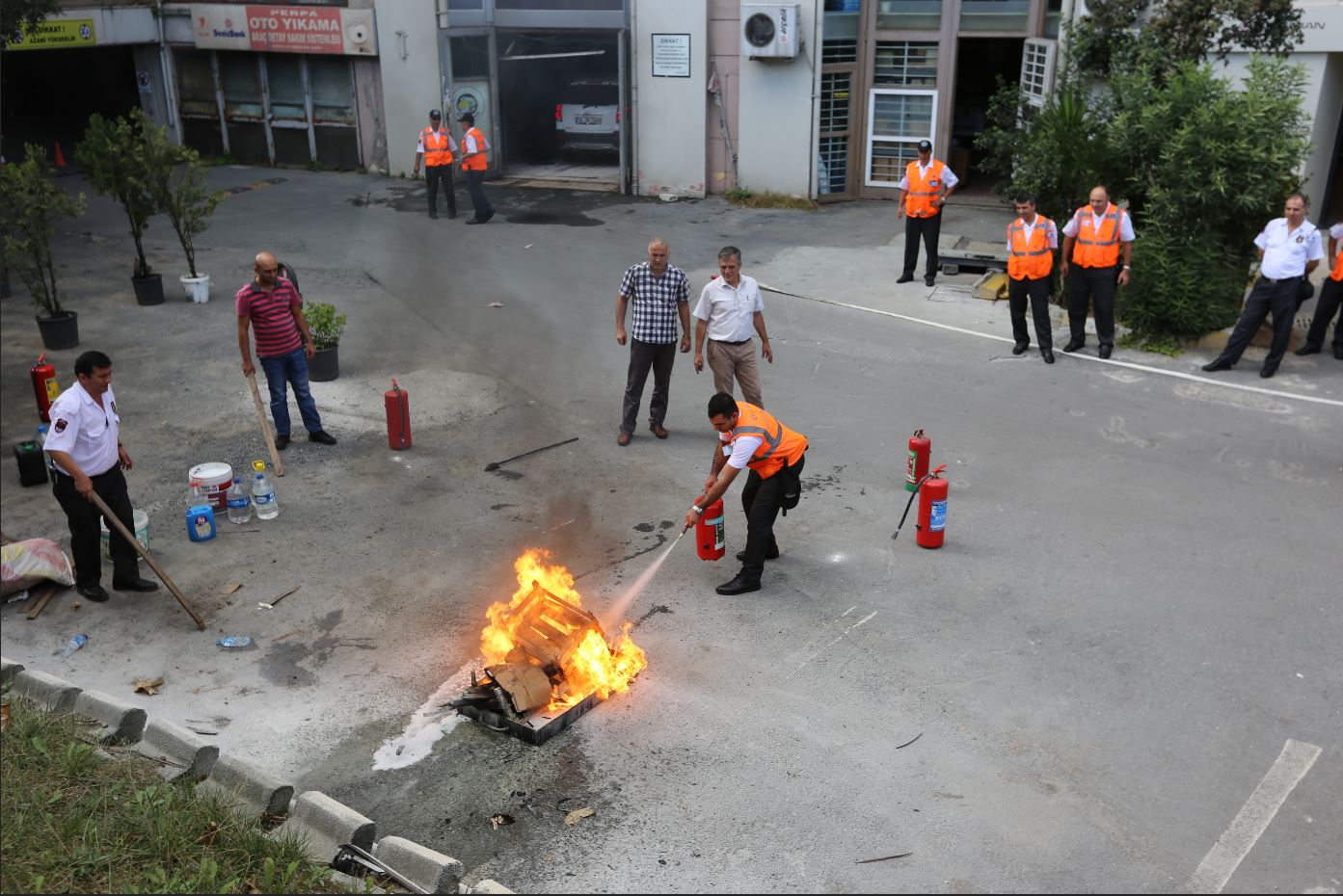 Perpa Ticaret Merkezi İş güvenliği uzmanı Muharrem Coşkun’un verdiği eğitimde yönetim personeli yangının oluşma nedenleri, yangın sırasında yapılacaklar, yangın söndürme ekipmanları, yangından kurtarma ve kendini koruma üzerine bilgilerini tekrarladılar.