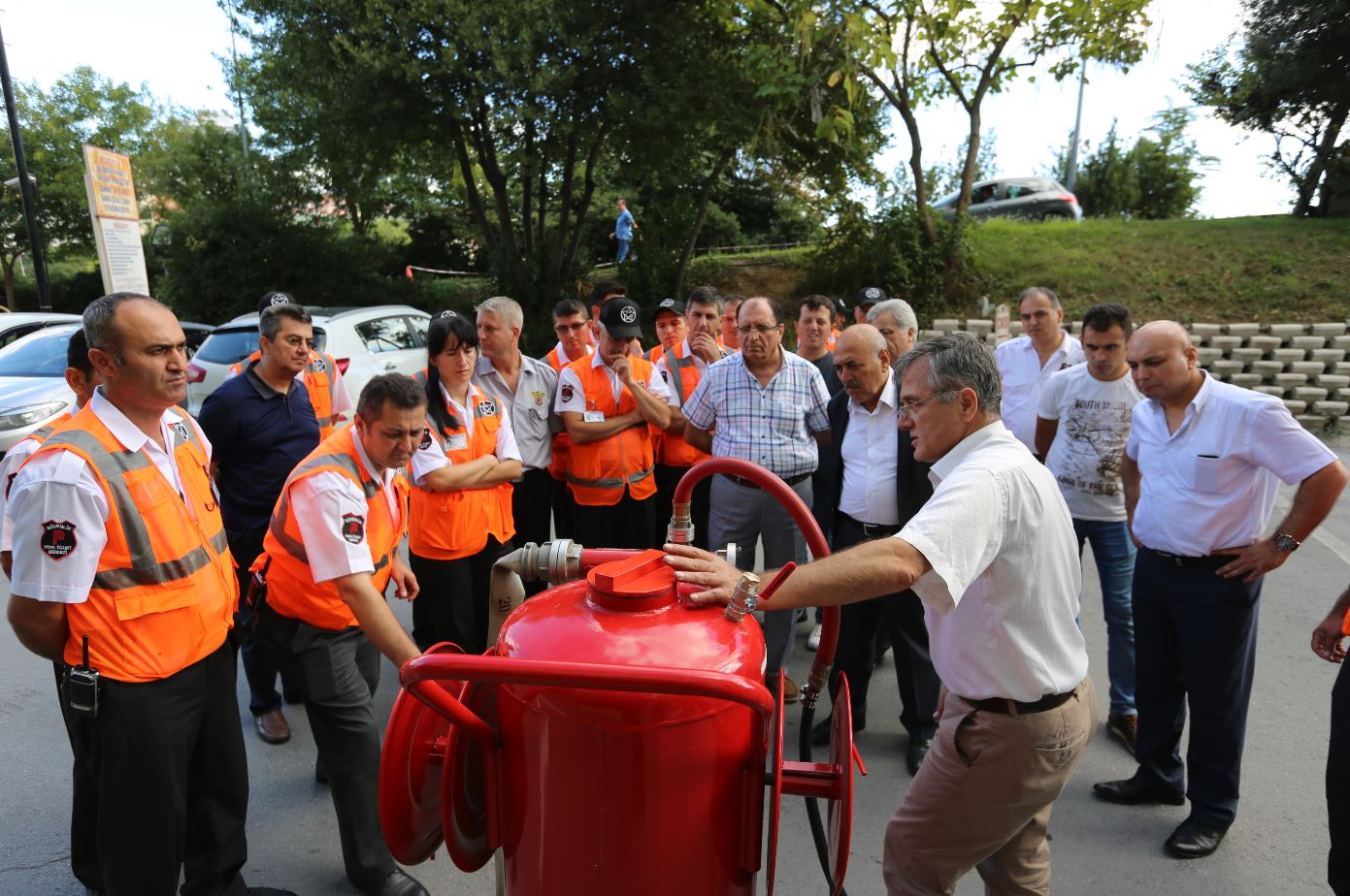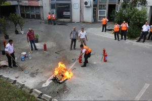 Teknik ve pratik eğitimin ardından yangın söndürme ekipmanlarıyla yangının nasıl söndürüleceğiyle ilgili tatbikat yapıldı.