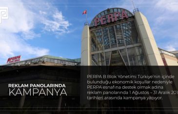 PERPA B Blok Yönetimi Türkiye’nin içinde bulunduğu ekonomik koşullar nedeniyle PERPA esnafına destek olmak adına reklam panolarında 1 Ağustos – 31 Aralık 2019 tarihleri arasında kampanya yapıyor. Asansör önü ve asansör içinde bulunan reklam panoları; Akbank yanı 21 – 22 numaralı asansör önü ve içi Orta Avlu 23 – 24 numaralı asansör önü ve içi […]